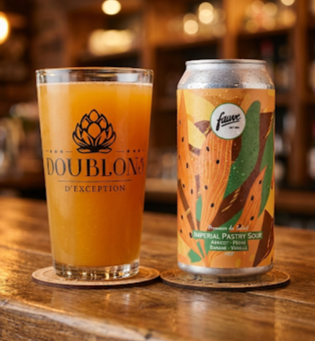 Bière de fermentation lactique à l'abricot (5%), à la pêche (2%) et à la banane (2%), et aromatisée à la vanille, brassée et conditionnée par